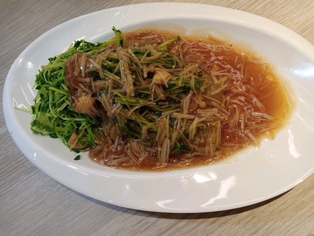 The pea sprouts topped with dried scallop gravy is another classic family dish that is ordered when there is a large group of people like the soup above.